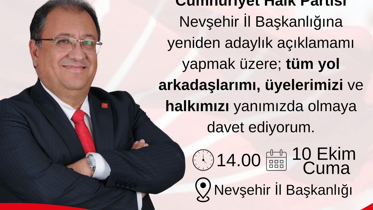 Cumhuriyet Halk Partisi Nevşehir İl Başkanı Av. Bülent Yumuş, yeniden adaylık açıklamasını 10 Ekim Cuma günü saat 14.00’te CHP Nevşehir İl Başkanlığında yapacak.