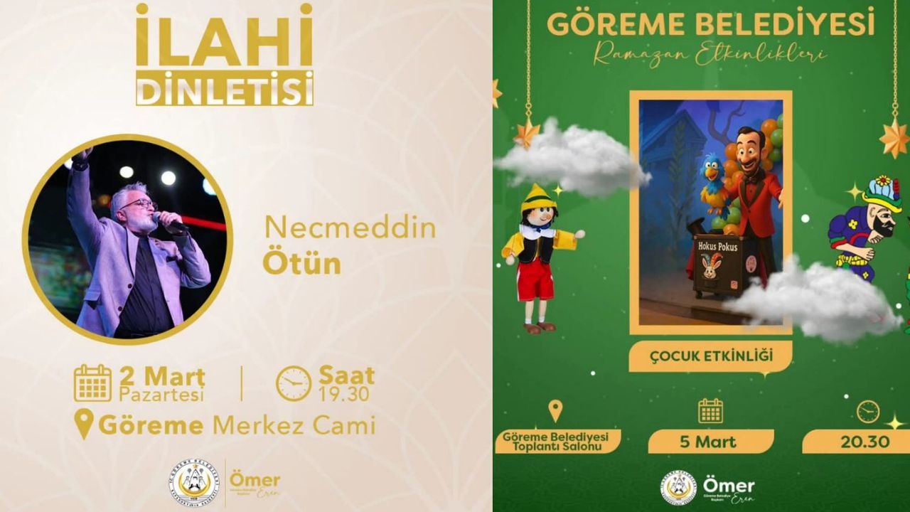 Göreme Belediyesi tarafından düzenlenen Ramazan etkinlikleri tüm coşkusuyla devam ediyor. Manevi atmosferi güçlendiren programlar kapsamında, gönüllere dokunan ilahi ve kasideleriyle tanınan Necmeddin Ötün hemşehrilerimizle buluşacak.