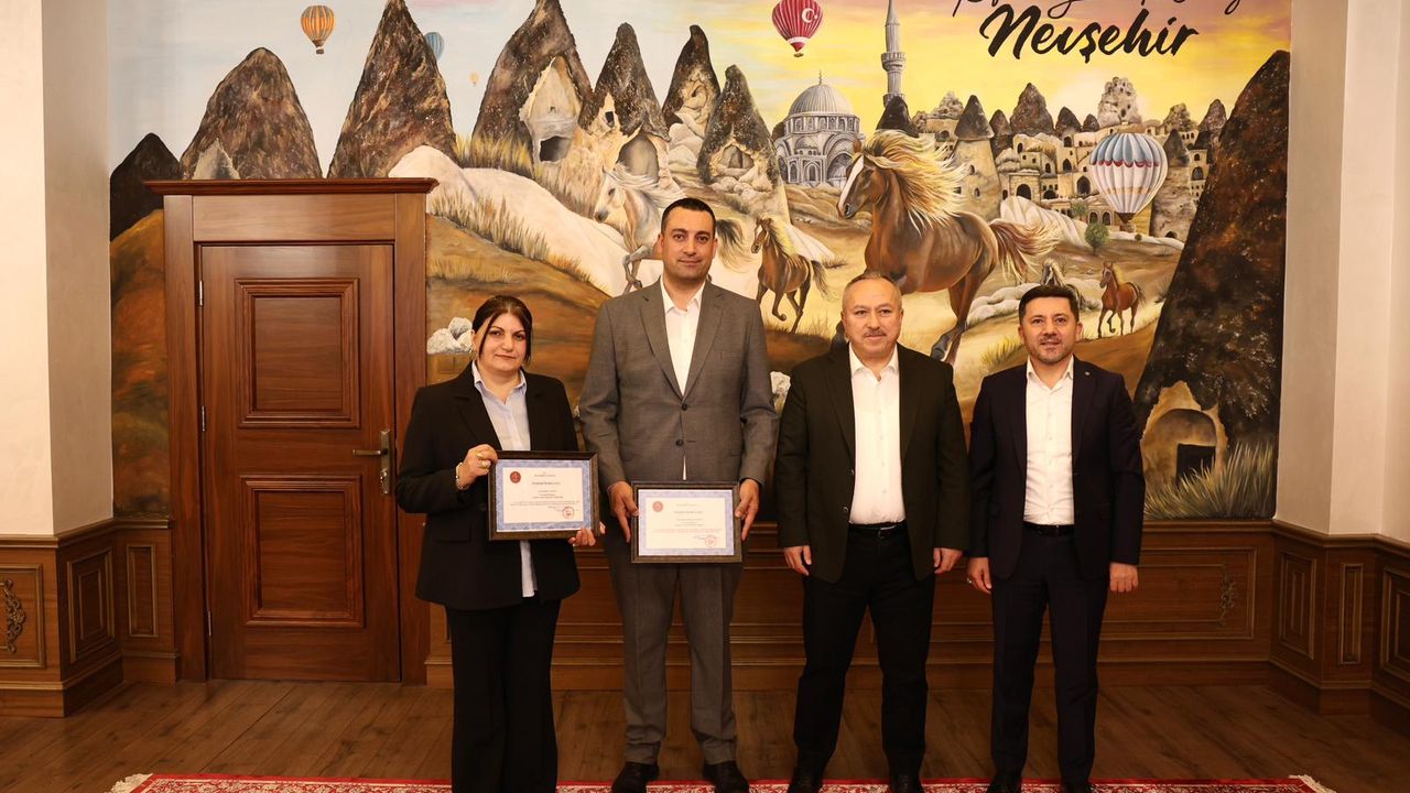 Belediye Başkanı Rasim Arı, 1001 ilmeğin atıldığı halı motifi plaketini Spor Şube Müdürü İyilikli ve Halı Atölye Hocası Turgut’la birlikte Nevşehir Valisi Ali Fidan’a takdim etti.