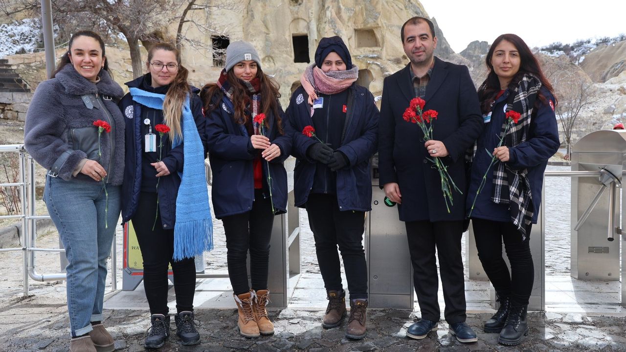 Kapadokya'nın önemli destinasyonları arasında yer alan Göreme Açık Hava Müzesi'ne gelen kadın turistlere Nevşehir Müze Müdürü Gökhan Maskar tarafından çiçek takdim edilerek Dünya Kadınlar Günü kutlandı. Müze girişinde gerçekleştirilen etkinlikte kadın ziyaretçilere çiçek verilirken, turistler bu anlamlı sürpriz karşısında mutluluk yaşadı.