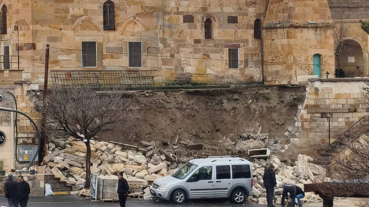 Nar kasabası’nda bulunan Camii Kebir’in tarihi değere sahip olduğu bilinen istinat duvarı, yoğun sağanak yağışların etkisiyle çöktü. Olayda olsun can kaybı veya yaralanan olmadı.