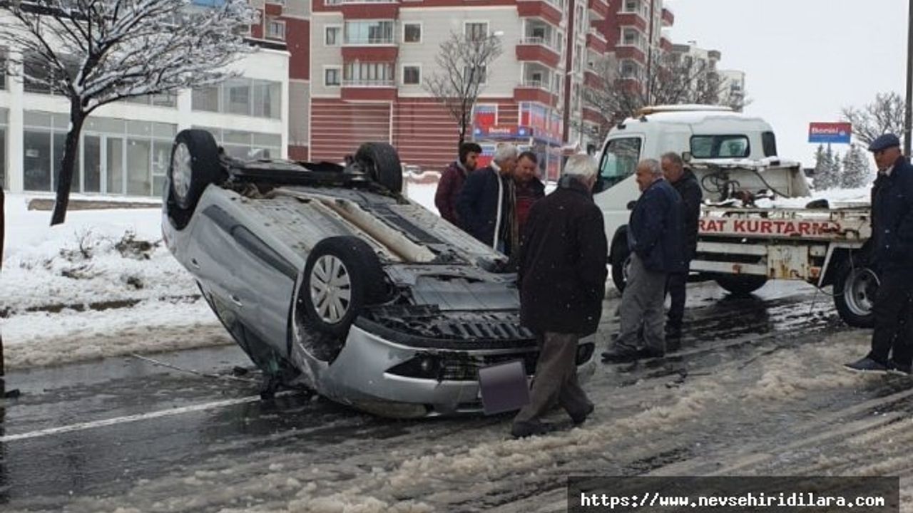 Gülşehir'den Nevşehir istikametine seyreden Renault Marka araç sürücüsü,Yenişehir blokları önünde karlı zeminde araç hakimiyetini kaybedip orta refüje çarparak takla attı. Kazada can kaybı olmaz iken büyük miktarda maddi hasar meydana geldi.