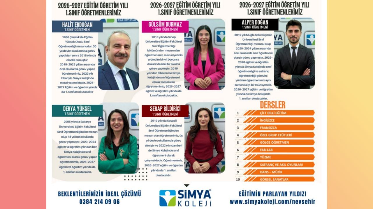 Nevşehir'de "Eğitimin Parlayan Yıldızı, Beklentilerinizin İdeal Çözümü" Simya Koleji en yenilikçi ve dinamik 1.sınıf eğitim kadrosuyla 2026-2027 eğitim öğretim yılı için kayıtlara devam ediyor. Simya Koleji kayıtlarına hız kesmeden devam ederken sınırlı sayıda kontenjan için velileri okula davet ediyor.