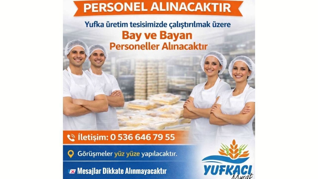 Yufkacı Murat, yufka üretim tesisinde görevlendirilmek üzere bay ve bayan personel alımı gerçekleştireceğini duyurdu.