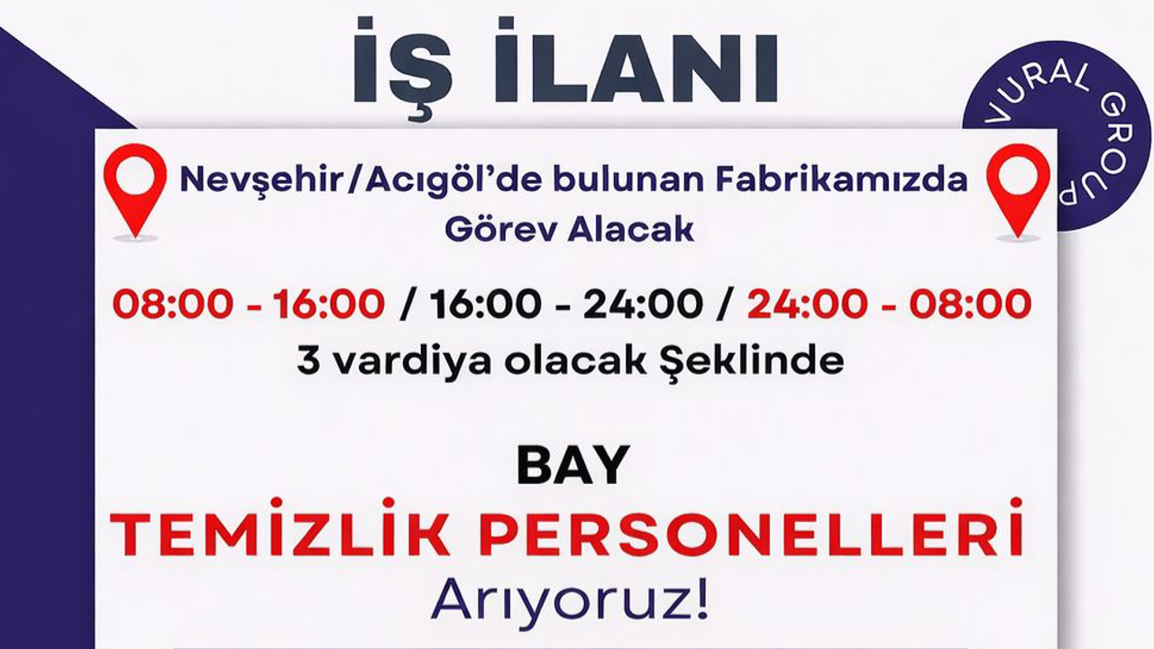Vural Group'tan yapılan açıklamaya göre, fabrikada istihdam edilecek personellerin 3 vardiya sistemiyle çalışacağı belirtildi. Çalışma saatlerinin 08.00–16.00, 16.00–24.00 ve 24.00–08.00 şeklinde planlandığı ifade edilirken, alımların bay temizlik personeli kadrosu için yapılacağı bildirildi.
