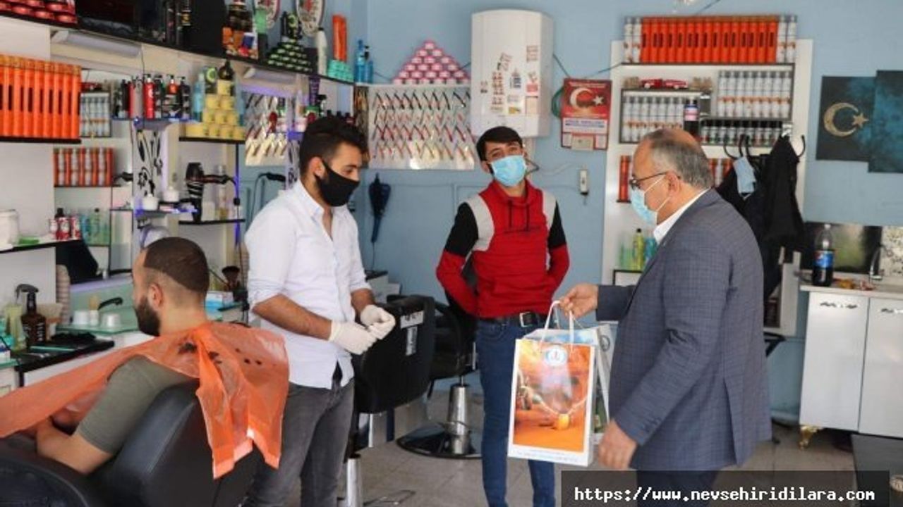 Derinkuyu Belediye Başkanı Bülent Aksoy berber ve kuaförlere Koronavirüs tedbirleri kapsamında hijyen seti hediye etti.