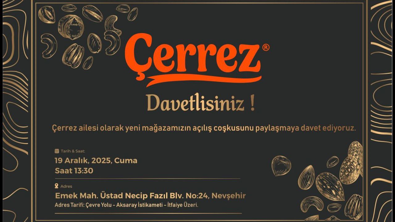 Çerrez mağazasının büyük açılışı, 19 Aralık 2025 Cuma günü saat 13.30’da gerçekleştirilecek. Açılış, çevre yolu Aksaray istikameti üzerinde, itfaiyeden önce sağ tarafta bulunan Nevşehir Merkez Emek Mahallesi Üstad Necip Fazıl Bulvarı No:24 adresinde yapılacak.