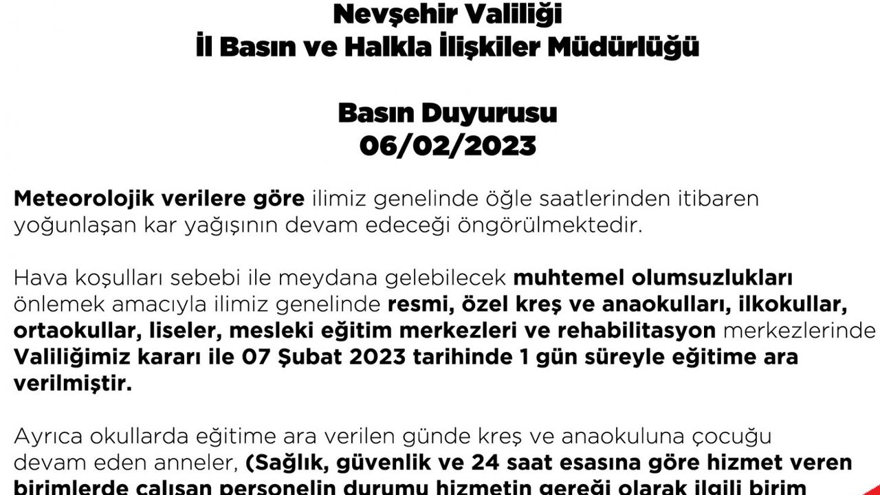 İlimiz genelindeki etkili olan yoğun kar yağışı nedeniyle tüm eğitim kurumlarının 1 gün süreyle tatil edilmesine dair basın duyurusu...