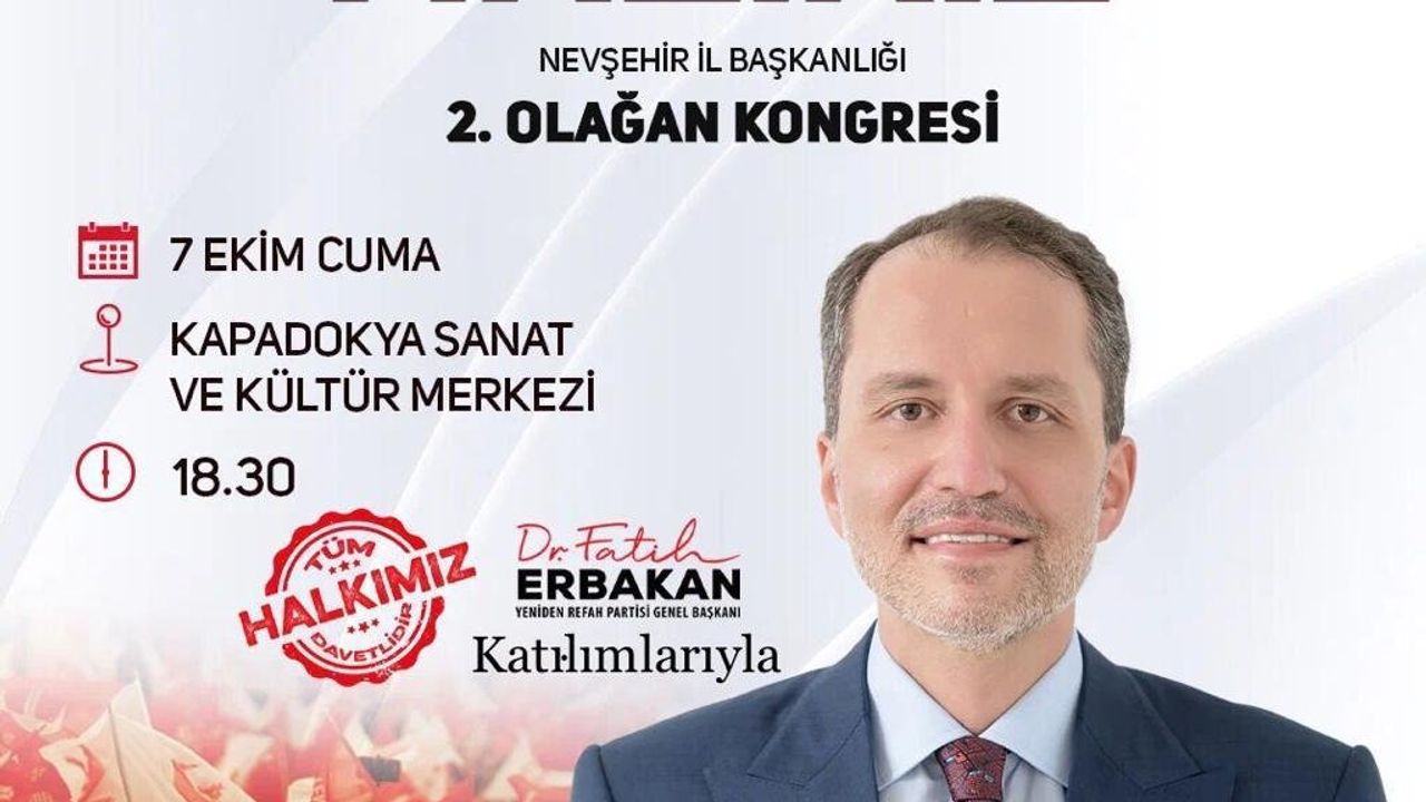 Yeniden Refah Partisi Genel Başkanı Dr.Fatih Erbakan, Türkiye'yi yönetmeye, dünyayı değiştirmeye hazırız sloganı ile Nevşehir İl Başkanlığı 2. Olağan Kongresi için, 7 Ekim Cuma günü, 18:30'da Kapadokya Kültür ve Sanat Merkezine gelecek.