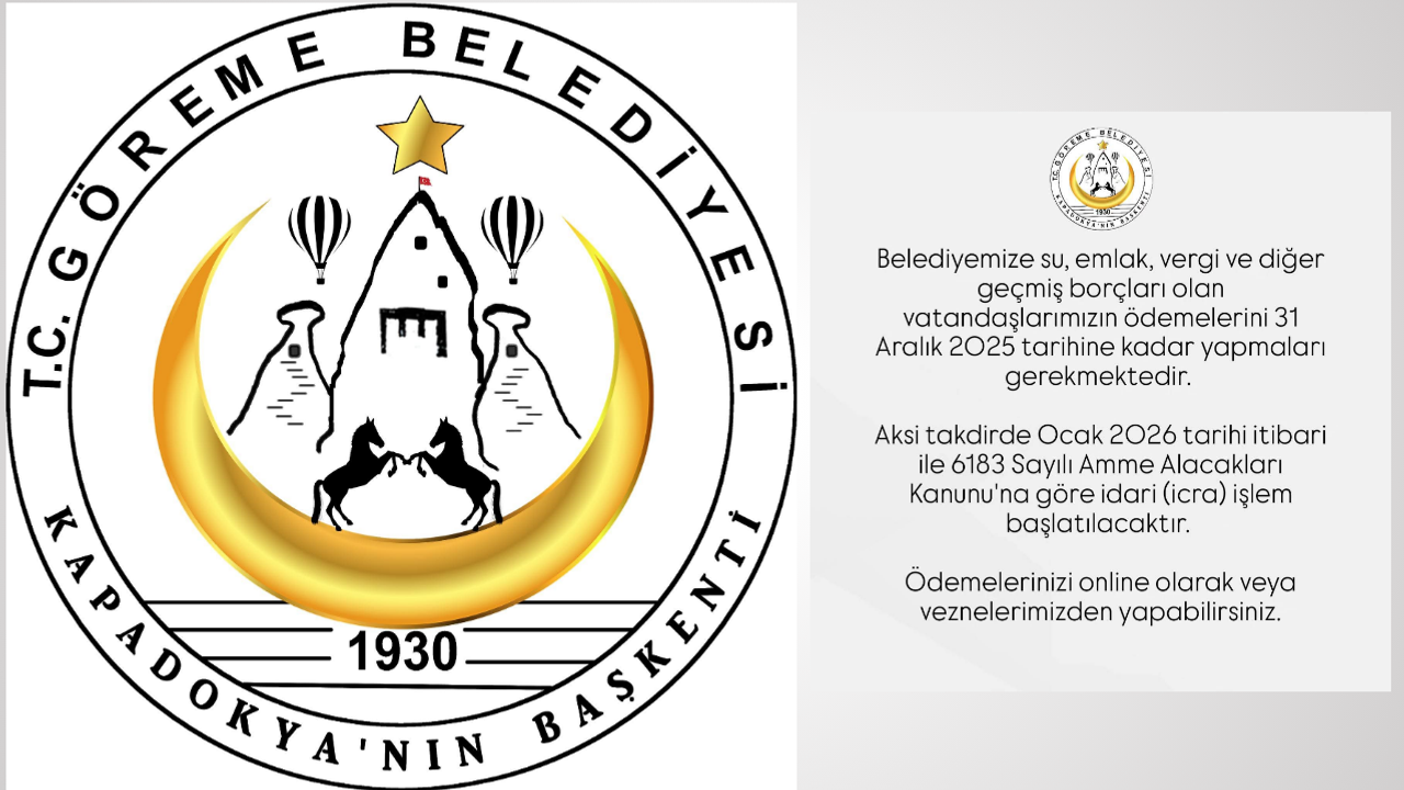 Göreme Belediyesi tarafından yapılan duyuruda, belediyeye su, emlak, vergi ve diğer geçmiş borçları bulunan vatandaşların ödemelerini 31 Aralık 2025 tarihine kadar yapmaları gerektiği bildirildi.