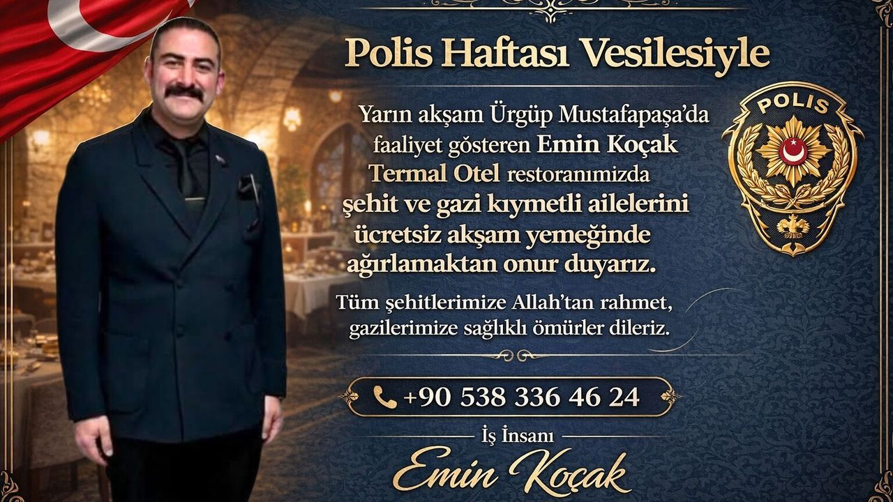 Ürgüp Mustafapaşa beldesinde faaliyet gösteren Emin Koçak Termal Otel, Polis Haftası dolayısıyla anlamlı bir organizasyona ev sahipliği yapacak.