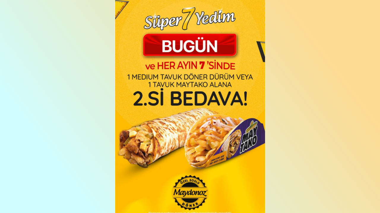 Maydonoz Döner tarafından duyurulan “Süper 7” kampanyası bugün itibarıyla başladı. Kampanya kapsamında, her ayın 7’sinde olduğu gibi bugün de geçerli olmak üzere 1 medium tavuk döner dürüm veya 1 tavuk maytako alanlara ikinci ürün bedava sunuluyor.