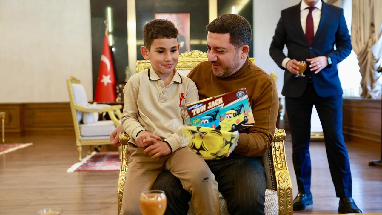 Minik misafirini makamında konuk eden Belediye Başkanı Rasim Arı, minik hayranı Ali Eymen Bayraktar’ın yönelttiği sorulara cevap vererek çeşitli hediyeler verdi.