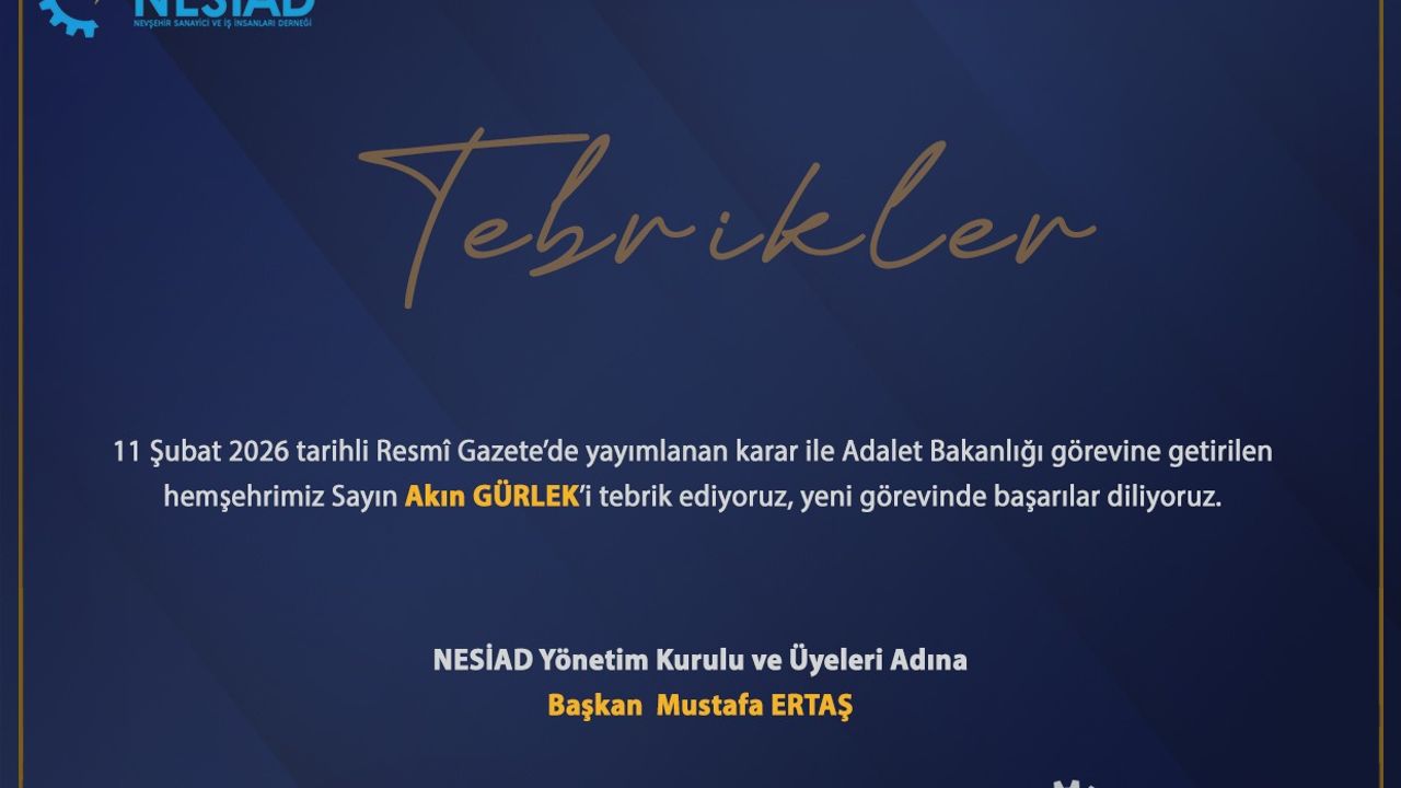 Nevşehir Sanayici ve İş İnsanları Derneği (NESİAD) Başkanı Mustafa ERTAŞ, Adalet Bakanlığı görevine getirilen hemşehrimiz Akın GÜRLEK için bir tebrik mesajı yayımladı.