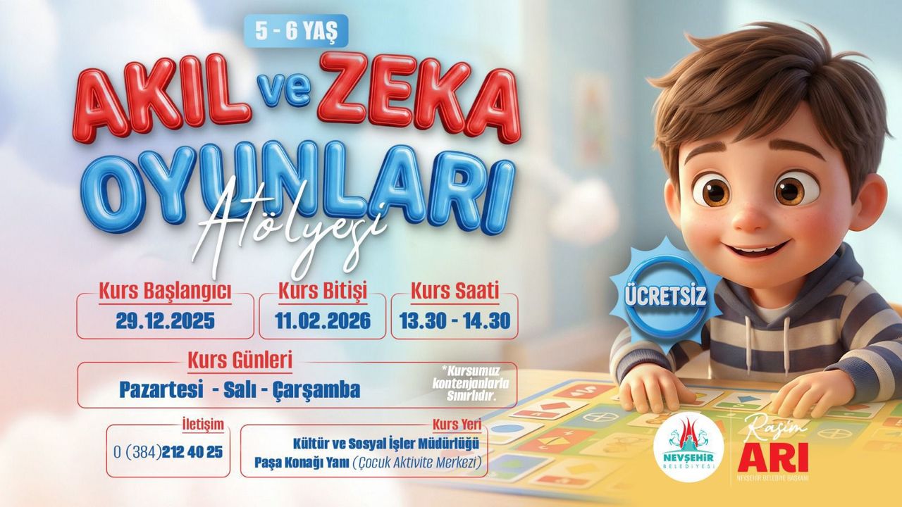Nevşehir Belediyesi tarafından 05 - 06 yaş çocuklarına yönelik Akıl ve Zekâ Oyunları Atölyesi düzenlenecek. Kültür, Sanat ve Sosyal İşler Müdürlüğü tarafından organize edilecek olan Akıl ve Zekâ Oyunları Atölyesi’nin çocukların zihinsel ve fiziksel gelişimlerine katkı sağlaması amaçlanıyor.