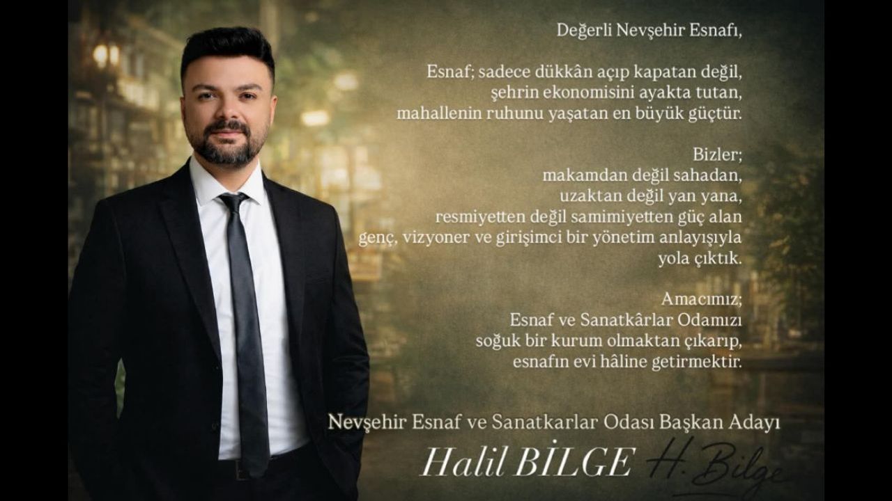 Nevşehir Esnaf ve Sanatkârlar Odası Başkan Adayı Halil Bilge, paylaştığı vizyon ve temel ilkeleriyle esnafa yönelik yönetim anlayışını kamuoyuyla paylaştı. Samimi, ulaşılabilir ve saha odaklı bir yönetim hedeflediklerini vurgulayan Bilge, esnafın sadece belirli günlerde hatırlanan değil, her zaman yanında olunan bir yapının merkezinde yer alması gerektiğini ifade etti.