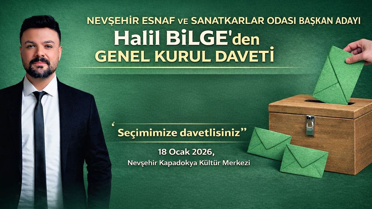 Nevşehir Esnaf ve Sanatkarlar Odası Başkan Adayı Halil Bilge, 18 Ocak 2026 tarihinde gerçekleştirilecek Seçimli Genel Kurul öncesinde esnaf ve sanatkârlara çağrıda bulundu.