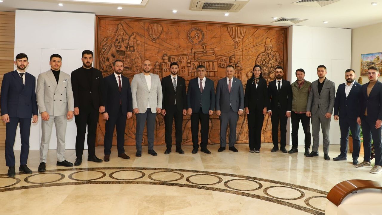 Nevşehir Ülkü Ocakları İl Başkanı Dr. Öğr. Üyesi Mehmet Uçar ve beraberindeki yönetim kurulu üyeleri, Nevşehir Hacı Bektaş Veli Üniversitesi (NEVÜ) Rektörü Prof. Dr. Semih Aktekin’i makamında ziyaret etti.