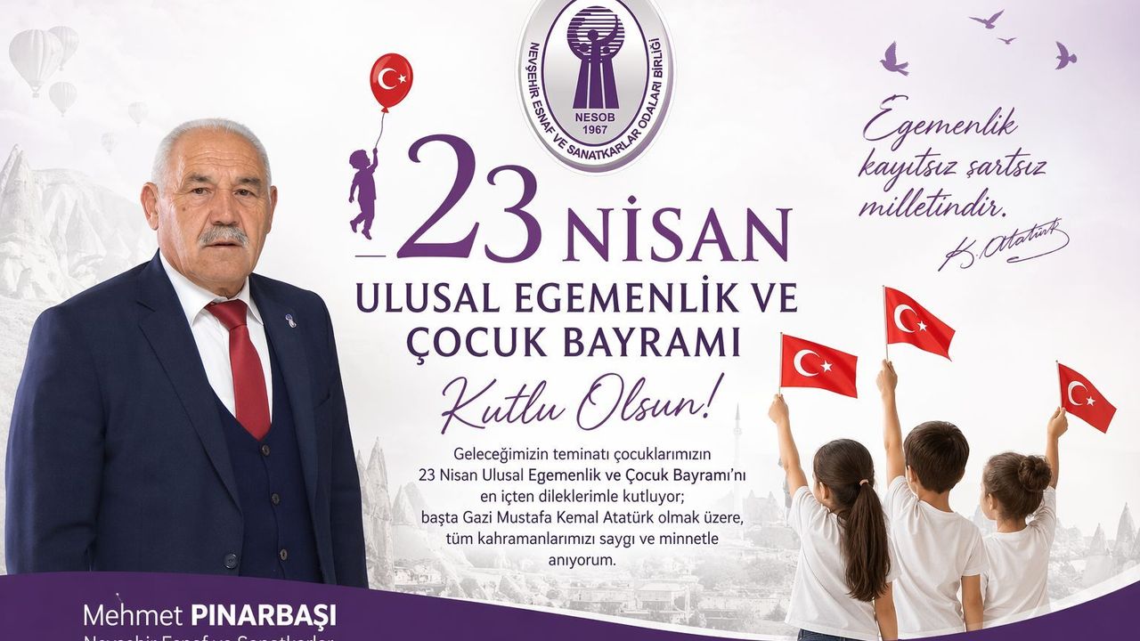Nevşehir Esnaf ve Sanatkarlar Odaları Birliği Başkanı Mehmet Pınarbaşı, 23 Nisan Ulusal Egemenlik ve Çocuk Bayramı münasebetiyle bir mesaj yayınladı.
