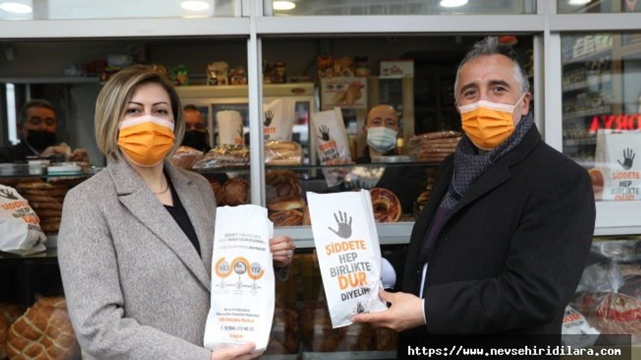 Nevşehir’deki büfe ve bakkallarda ekmekler bugün, kadına yönelik şiddete dikkat çekmek amacıyla "Şiddete Hep Birlikte Dur Diyelim " yazılı kese kâğıtlarıyla müşterilere sunuldu. Nevşehir Belediyesi tarafından ayrıca işyerlerine kadına yönelik şiddete dikkat çekmek için hazırlanan flamalar dağıtıldı.