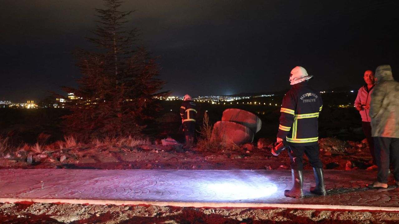 Nevşehir'de ucu açık bırakılan elektrik kablosu yağmurun etkisiyle kısa devre yaparak alev aldı.